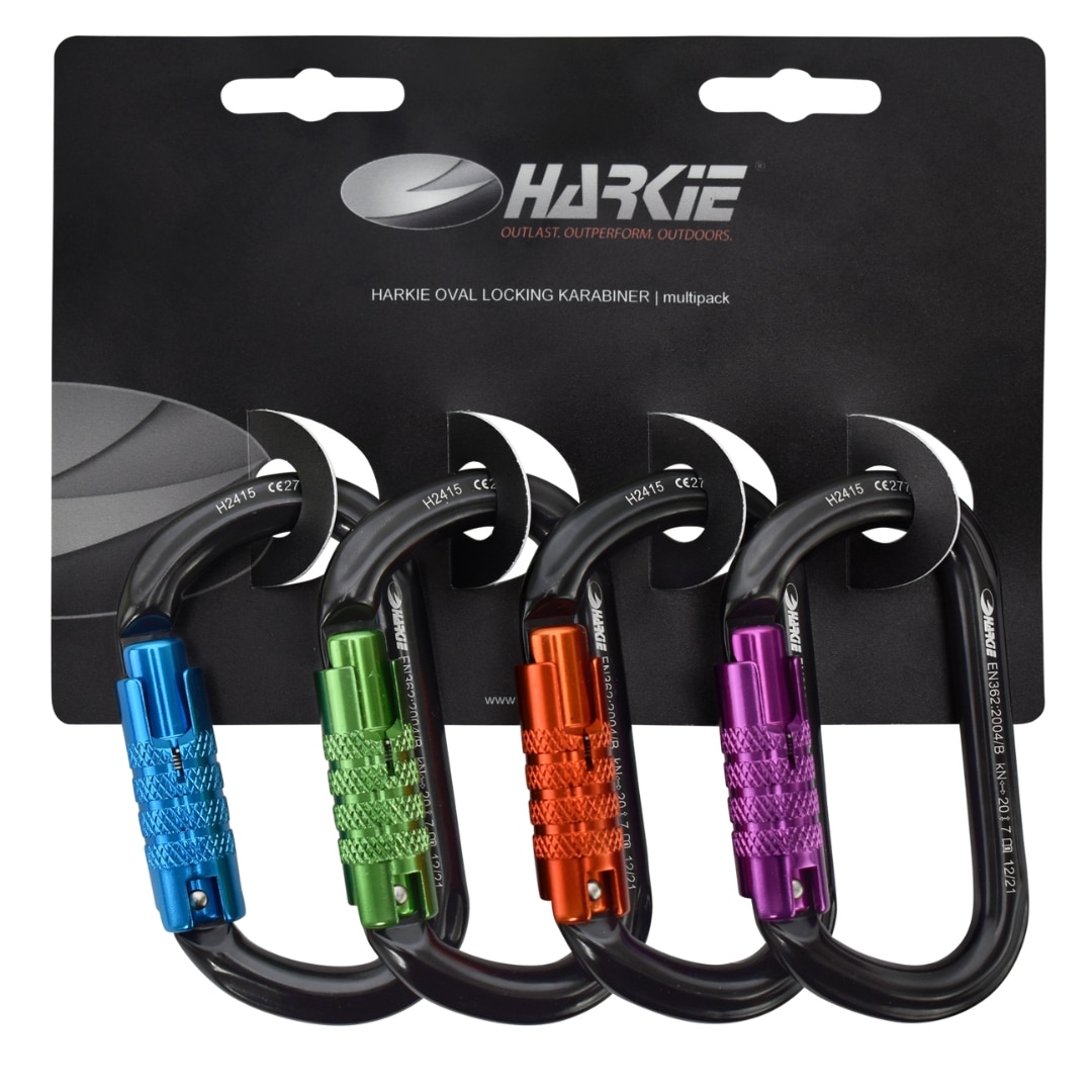 The Harkie Oval 3-Way Lock Karabiner Multi Pack includes multiple durable aluminium oval carabiners with triple-locking gates for secure, reliable connections—ideal for climbing, arborist rigging and general rope-work setups.