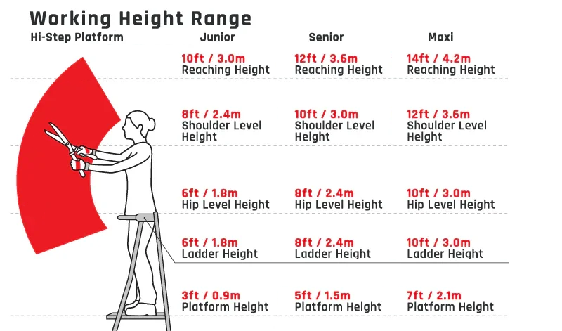 | Ladder Size | Platform Height | Hip Level | Reaching Overhead | Ladder Weight |