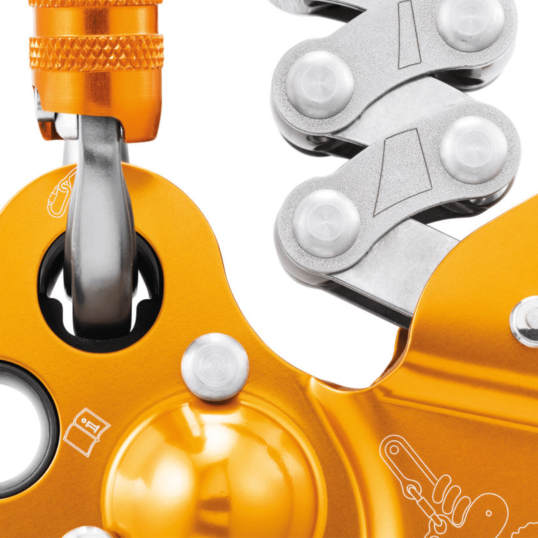 The ZIGZAG device is intuitive to use, mimicking the classic Prusik pulley system technique. The friction chain automatically locks on the rope when extended, while the release lever allows smooth rope feed and precise speed control. The pulley, mounted on sealed ball bearings, ensures that slack is easily taken up, reducing strain and increasing efficiency during ascents and repositioning.